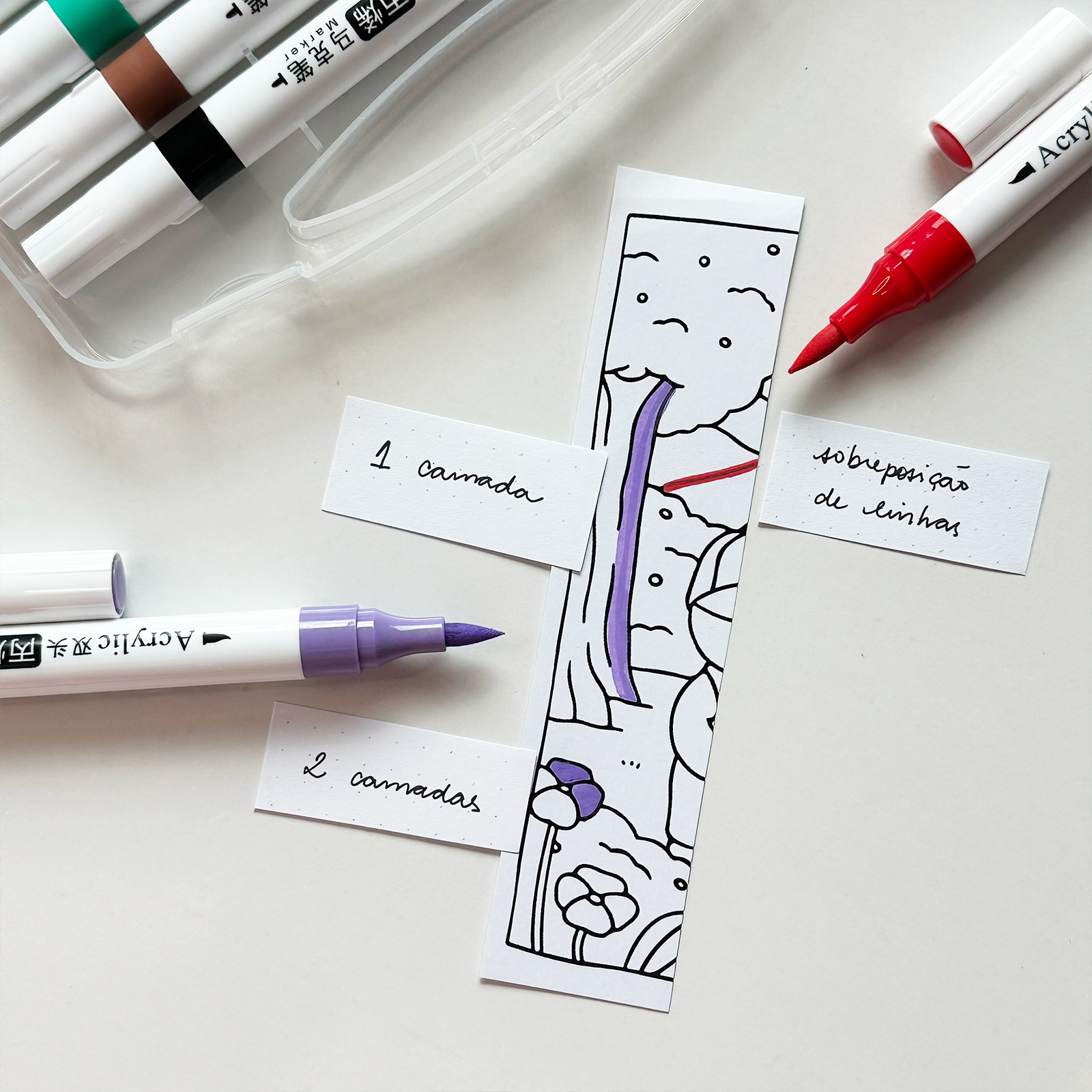 Com os marcadores acrílicos de duas pontas, cada traço vira arte. A ponta brush traz fluidez e movimento, enquanto a arredondada garante firmeza nos contornos e acabamentos. A tinta acrílica é opaca, vibrante e cobre até superfícies escuras, funcionando em papel, madeira, vidro, pedra e muito mais.