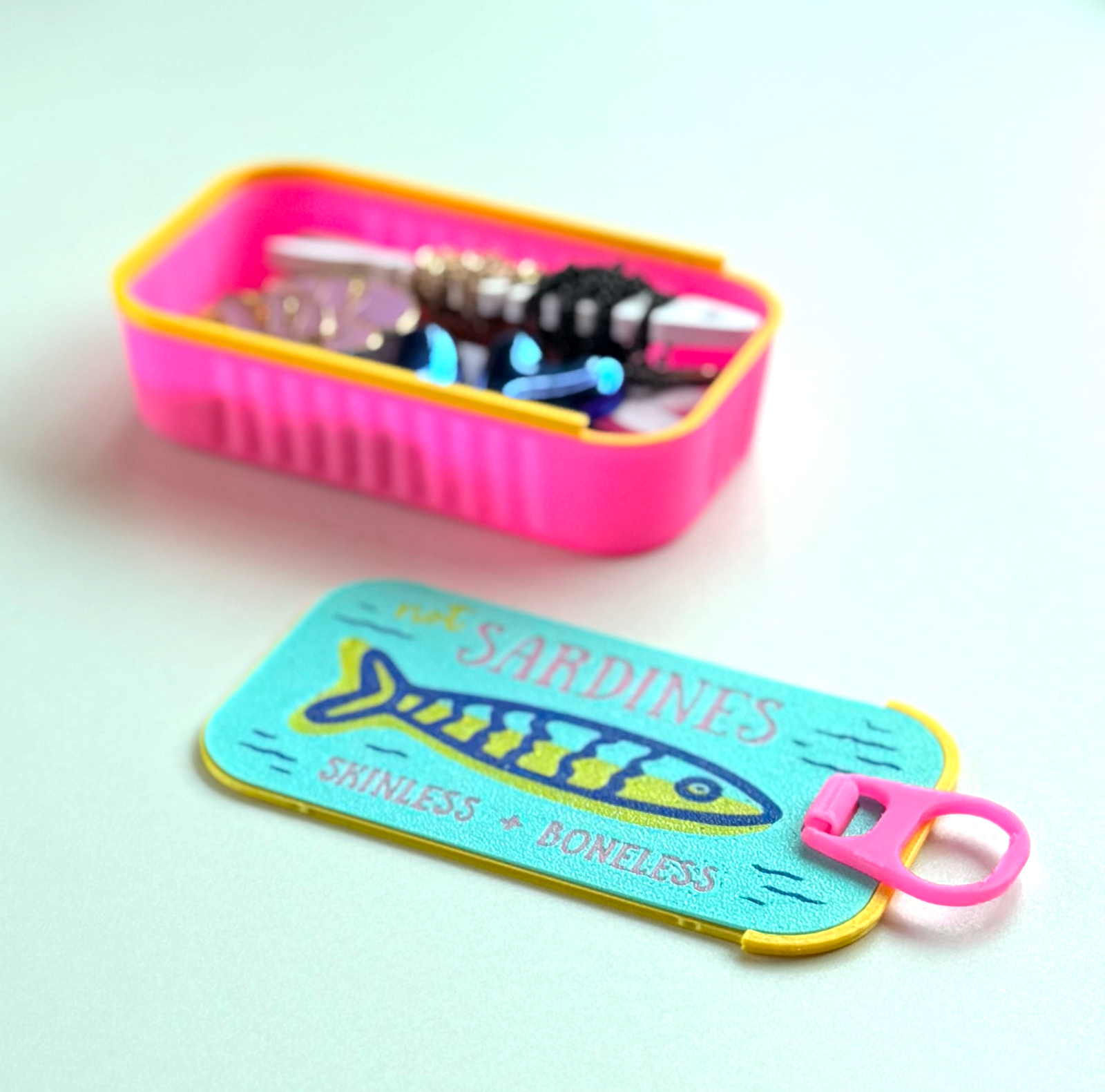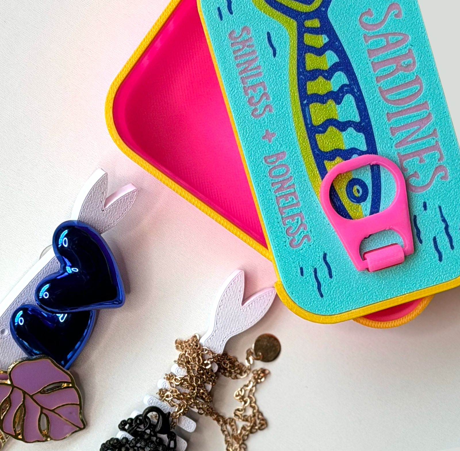 • Diferenciais: Estampa de Sardinhas feita em impressora 3D, Dentro possui 2 esqueletos de sardinhas, um com pequenos furos pra colocar brincos e o outro simulando a espinha pra enrolar colares.
